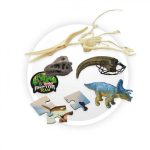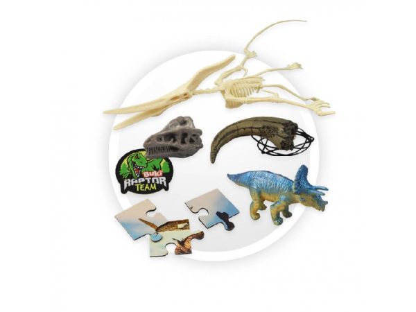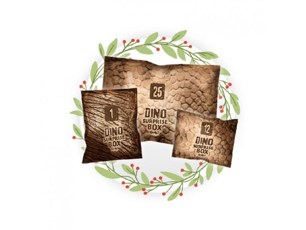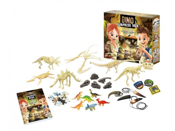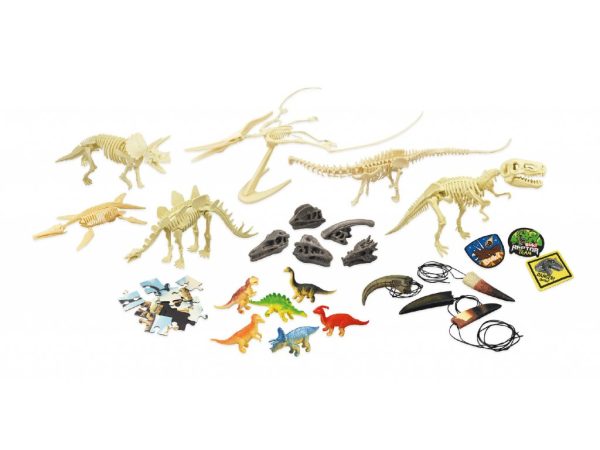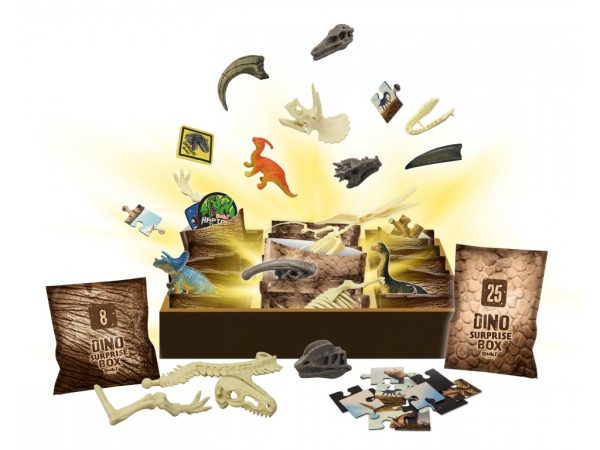 Táto súprava obsahuje 25 balíčkov s rôznymi darčekovými predmetmi s tématikou dinosaurov. Nájdete tam napríklad dinosaurí zub so špagátom na krk, puzzle kostier rôznych druhov dinosaurov, textilné nášivky, figúrky aj lebky dinosaurov, magnetky a ďalšie.