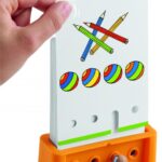 Logické karty nemiešajte a všetky vložte do krabičky. Malú kartu (obrazovka) vložte dopredu pred logické karty. Vložte drevený kolík do ľavého otvoru, zatiahnite za prednú logickú kartu a umiestnite ju úplne dozadu bez toho aby sa otočila.