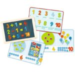 Kufrík obsahuje pozadia s klasickými typmi matematických úloh a magnetické čísla aj predmety, ktoré do nich môžete dopĺňať. Úlohy si tak môžete zadávať vzájomne – alebo si deti zmerajú sily v počtoch medzi sebou.